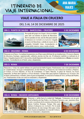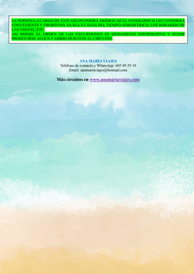 Para más información de este viaje u otras, llámanos o escríbenos un Whatsapp al 605892910 o mándanos un e-mail a anamariaviajes@hotmail.com y le atenderemos en el menor tiempo posible.
